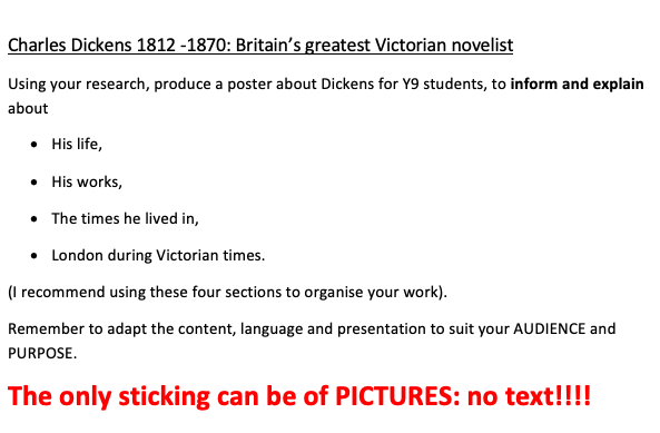 I figured that if they had a print out of the sheet, they would be able to take it home to finish off for homework (a fantastic motivating factor!). I also added to this homework, by telling them to find 5 fascinating facts about Bleak House. I am hoping that this will help them to have an idea about what the mammoth novel is about, before approaching it with them next week.